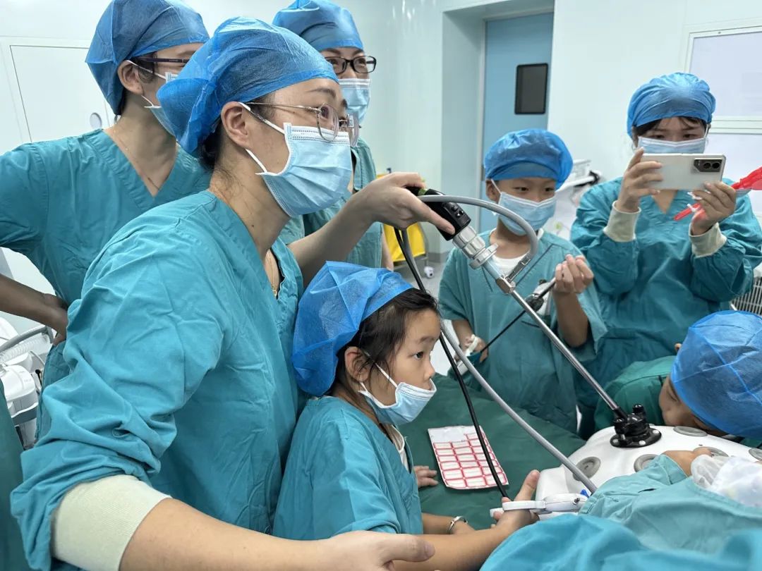 腹腔镜手术演示区引起了孩子们极大的兴趣。屏幕上清晰显示着通过几个“小孔”在体内进行的精细操作。孩子们惊叹于微创手术的“神奇”,原来医生的“手术刀”可以如此“温柔”,创伤如此之小。
